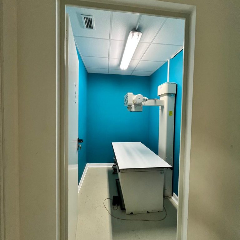 Espacio blindado para obtener imágenes diagnósticas animales mediante radiación, equipado con mesa, chasis y monitores para evaluar lesiones internas rápidamente.